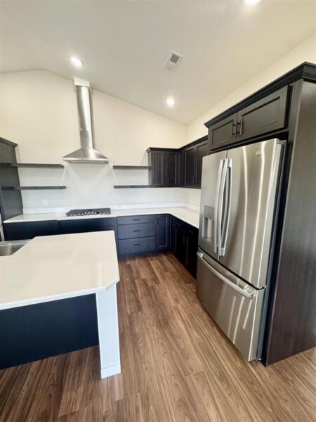 with large windows. Chef’s kitchen with gas stove top, solid
