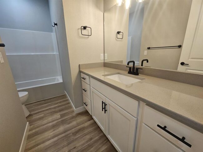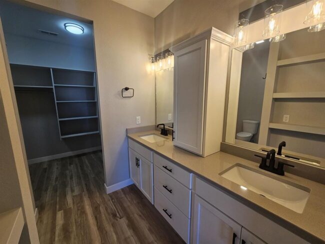 will find sleek-modern farmhouse style lighting and plumbing